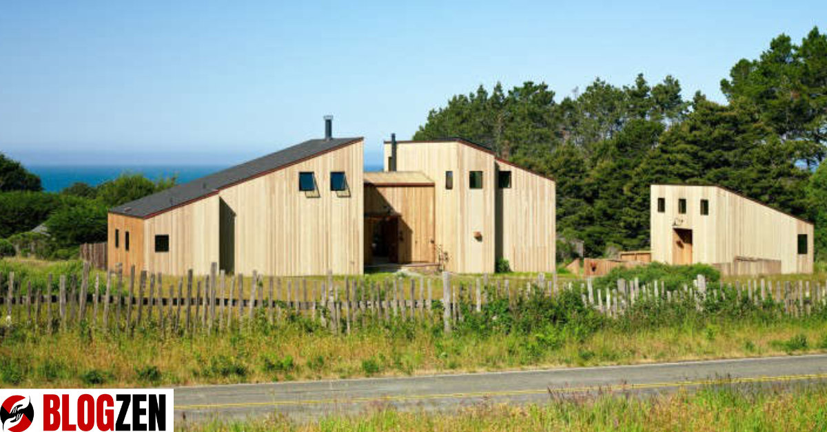 The structures often feature weathered wood exteriors that blend with the coastal grasses and cliffs. Rooflines are low and angular, designed to withstand strong ocean winds while maintaining a subtle presence in the landscape.